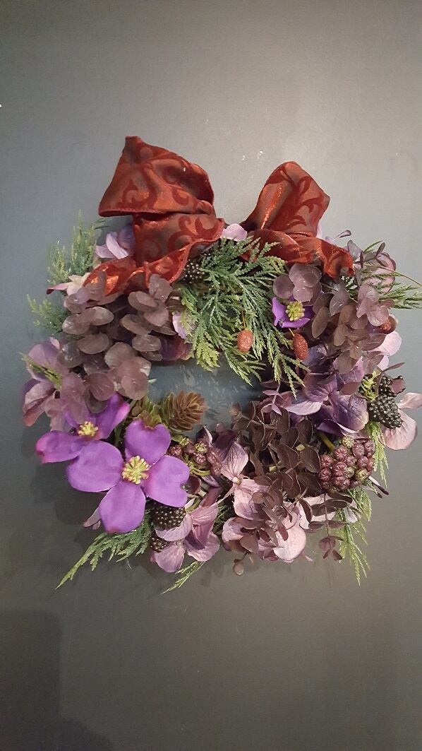 エレガントなパープルの花々が集まった華やかなリースです。ラベンダーやヒヤシンスなど、色とりどりの花が一つの美しさを引き立てています。お部屋のインテリアとしてはもちろん、ご結婚や大切な記念日のプレゼントにも最適です。
